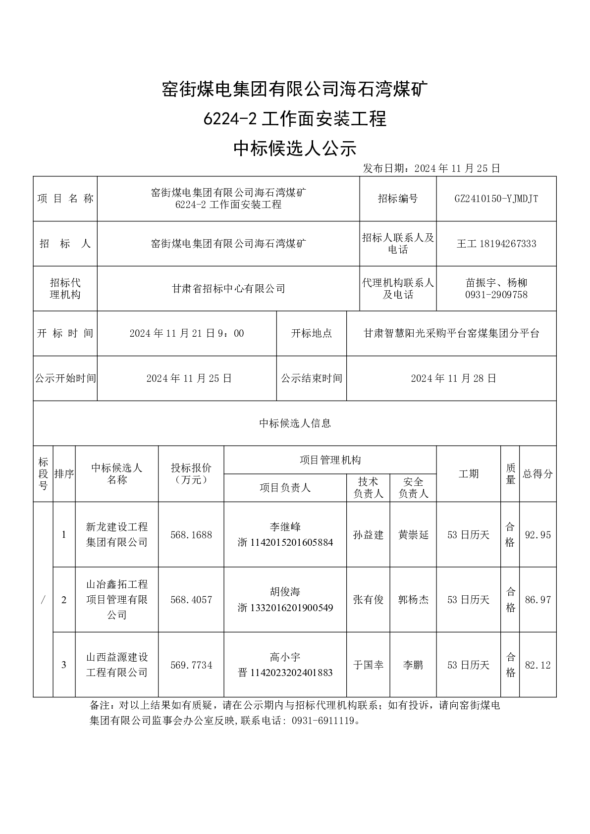 窑街煤电集团有限公司海石湾煤矿 6224-2 工作面安装工程 中标候选人公示