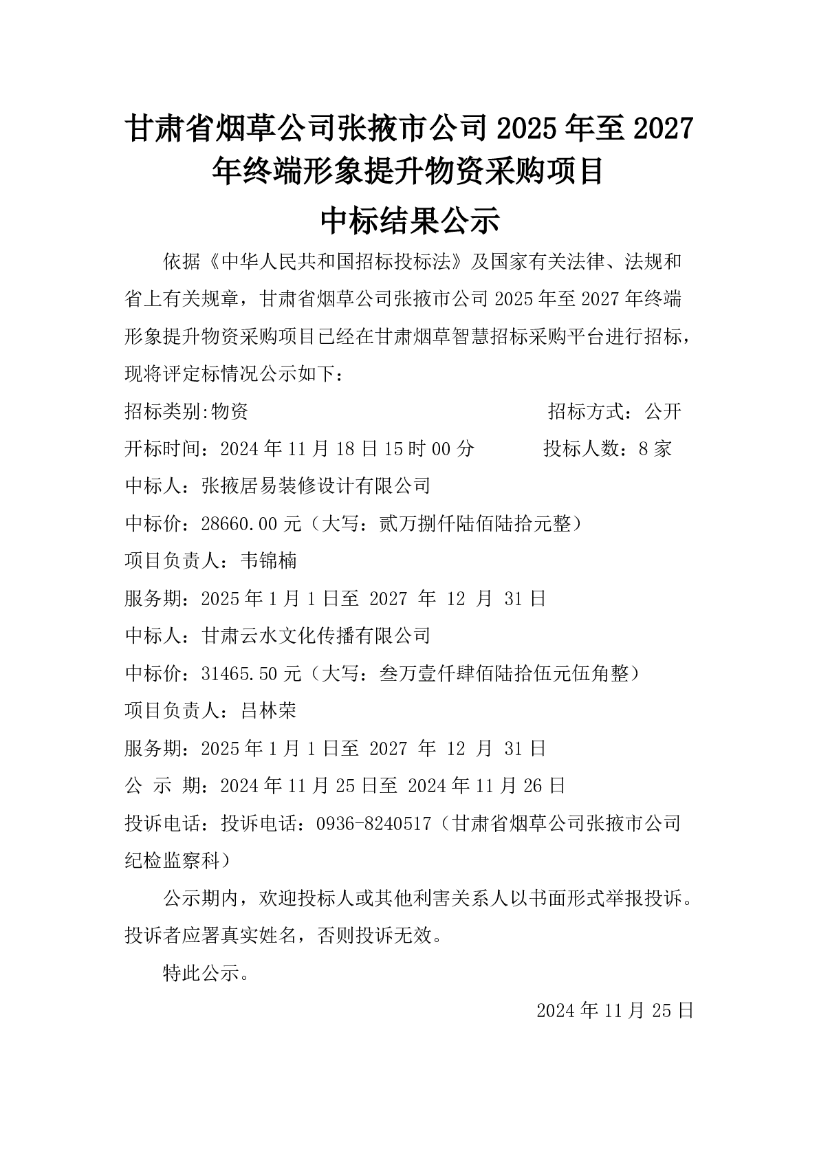 甘肃省烟草公司张掖市公司2025年至2027年终端形象提升物资采购项目中标结果公示
