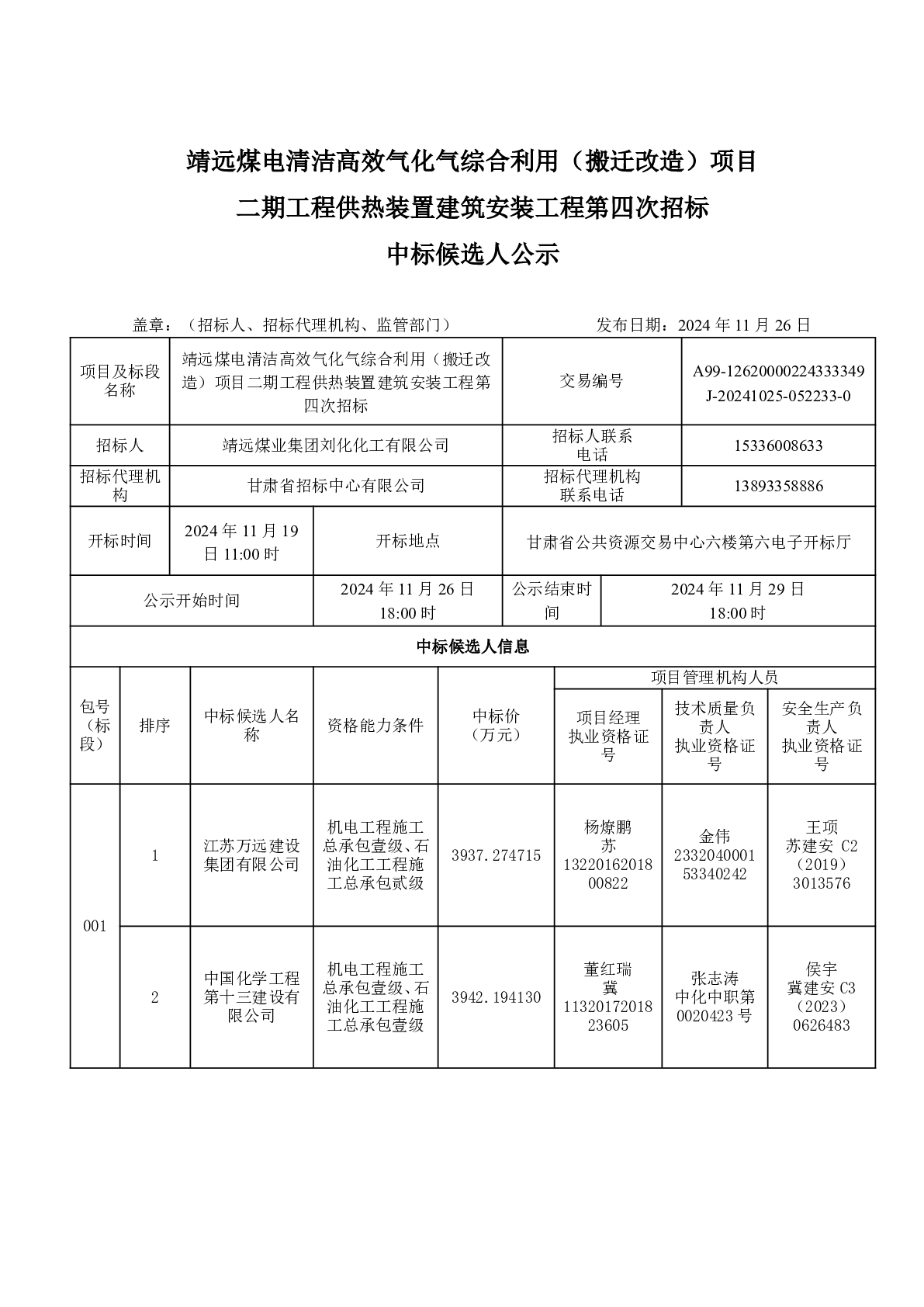 靖远煤电清洁高效气化气综合利用(搬迁改造)项目 二期工程供热装置建筑安装工程第四次招标 中标候选人公示