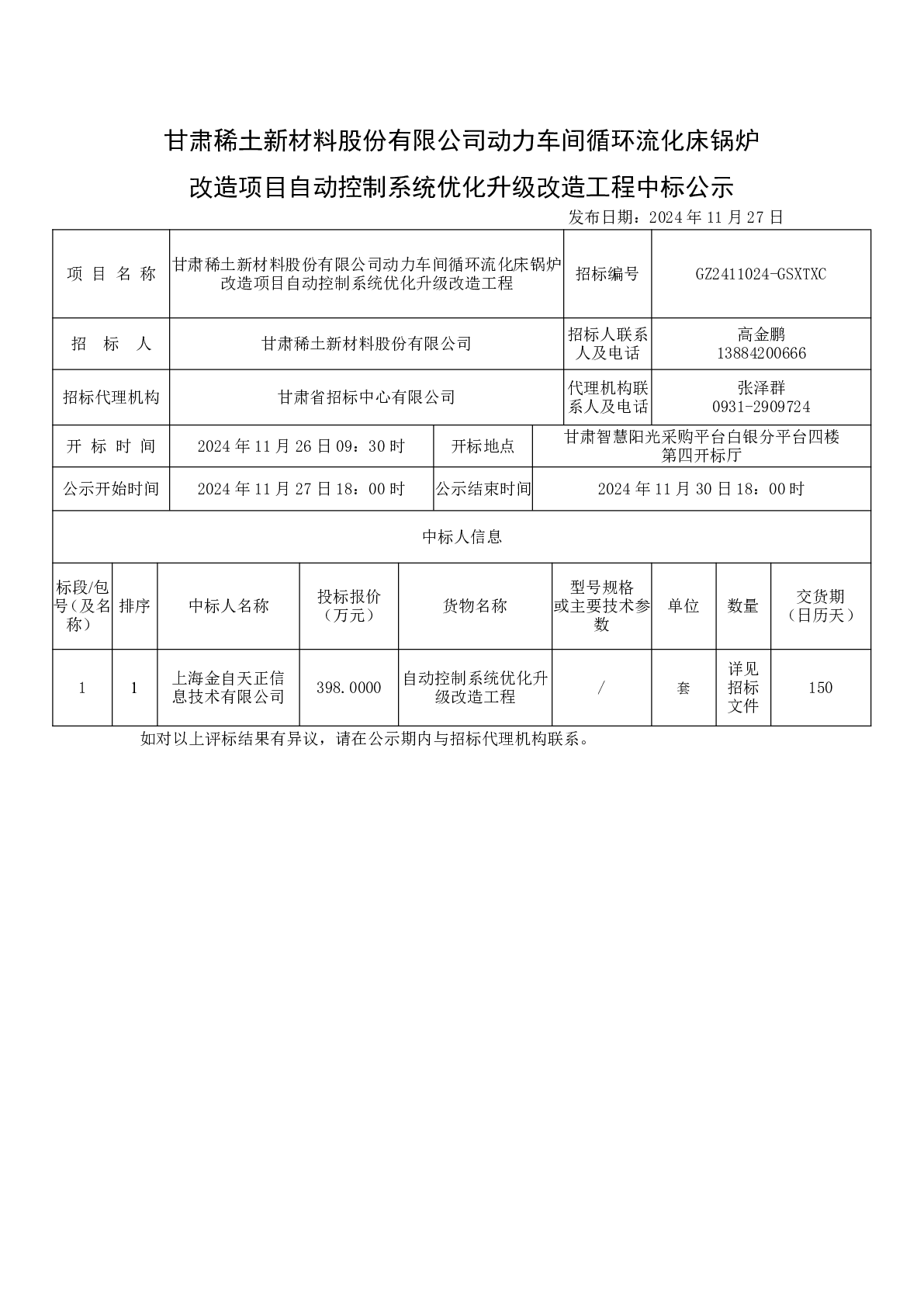甘肃稀土新材料股份有限公司动力车间循环流化床锅炉 改造项目自动控制系统优化升级改造工程中标公示