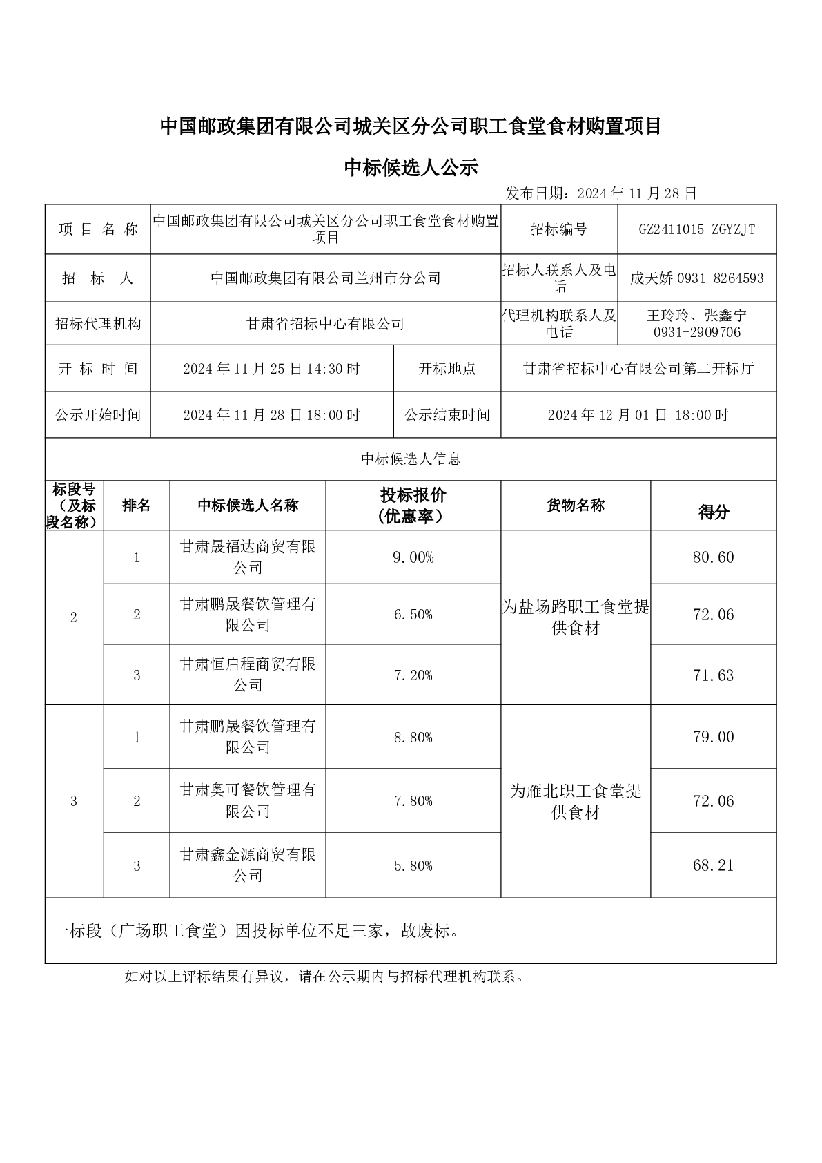 中国邮政集团有限公司城关区分公司职工食堂食材购置项目 中标候选人公示