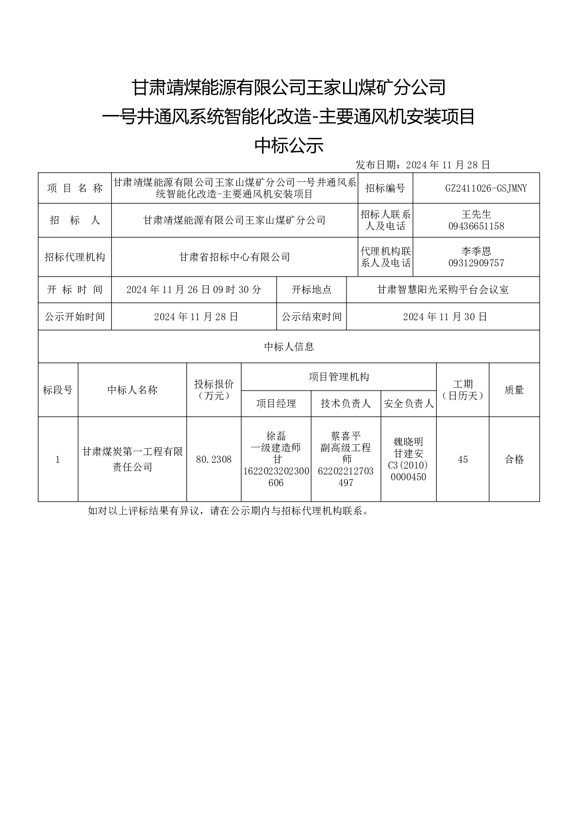 甘肃靖煤能源有限公司王家山煤矿分公司 一号井通风系统智能化改造-主要通风机安装项目 中标公示