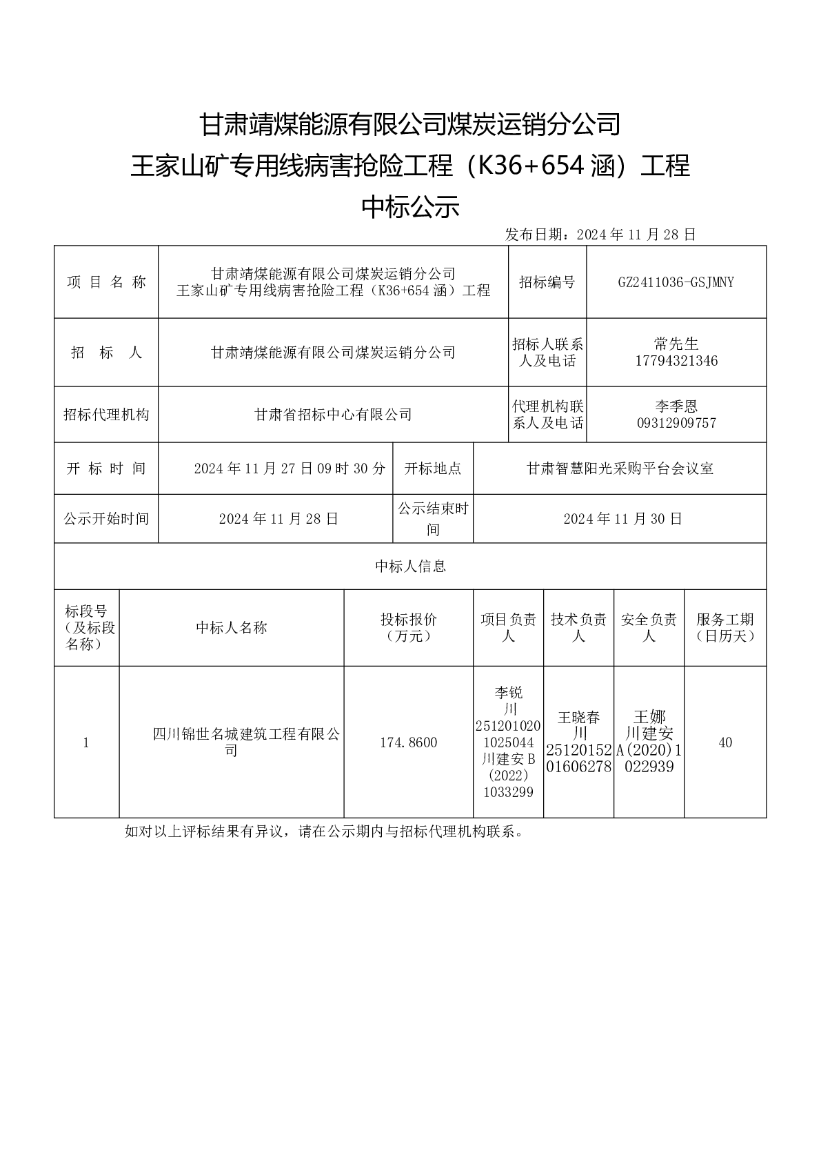 甘肃靖煤能源有限公司煤炭运销分公司 王家山矿专用线病害抢险工程(K36+654 涵)工程 中标公示