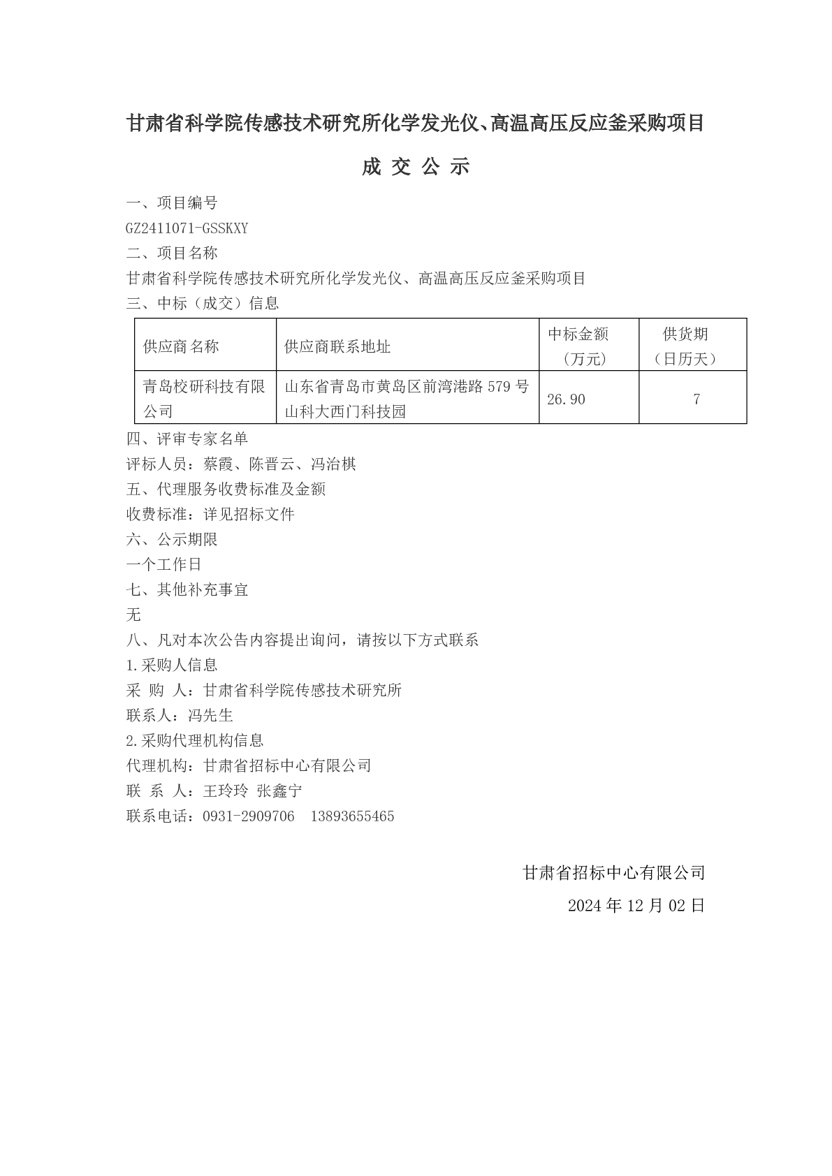 甘肃省科学院传感技术研究所化学发光仪、高温高压反应釜采购项目 成 交 公 示