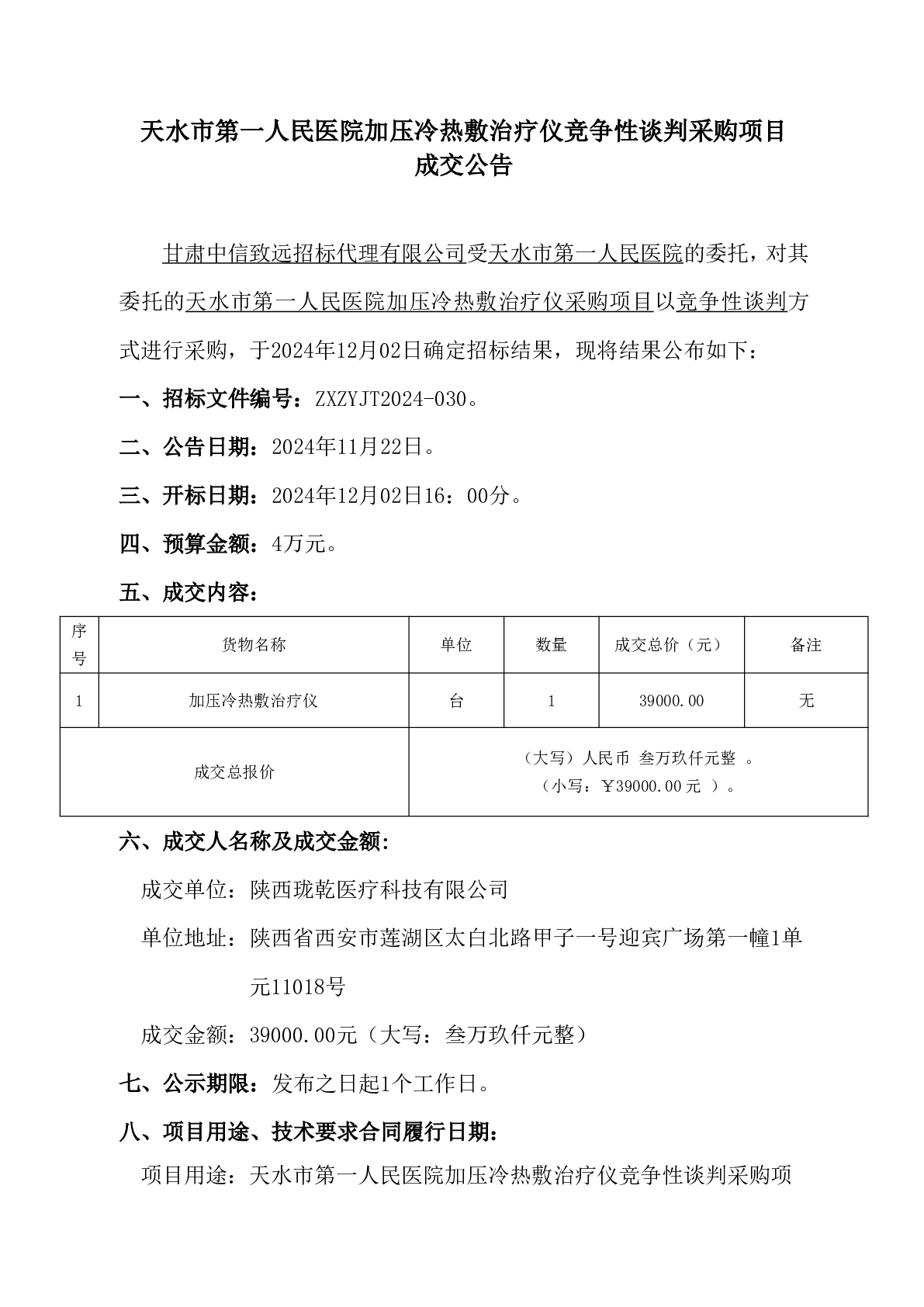天水市第一人民医院加压冷热敷治疗仪竞争性谈判采购项目成交公告