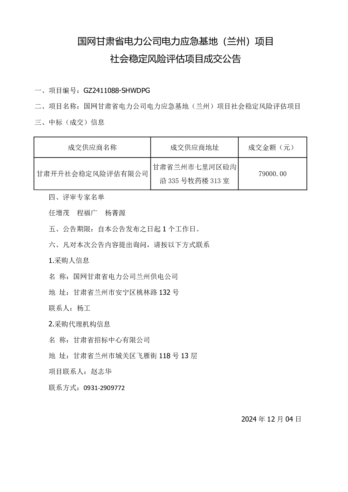 国网甘肃省电力公司电力应急基地(兰州)项目 社会稳定风险评估项目成交公告