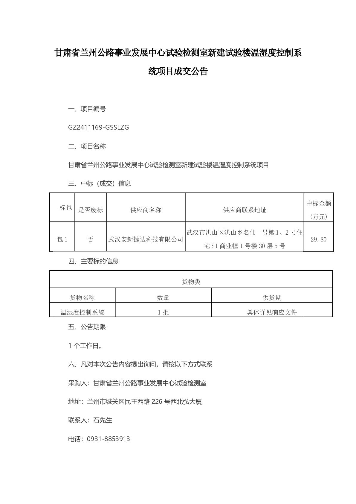 甘肃省兰州公路事业发展中心试验检测室新建试验楼温湿度控制系 统项目成交公告