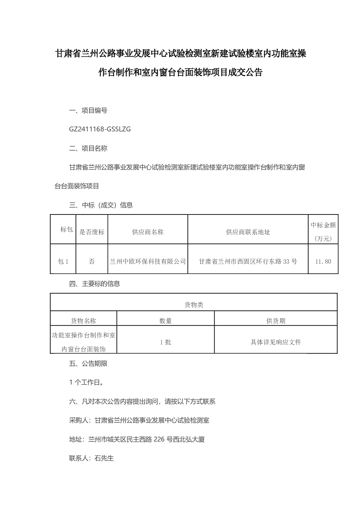 甘肃省兰州公路事业发展中心试验检测室新建试验楼室内功能室操 作台制作和室内窗台台面装饰项目成交公告