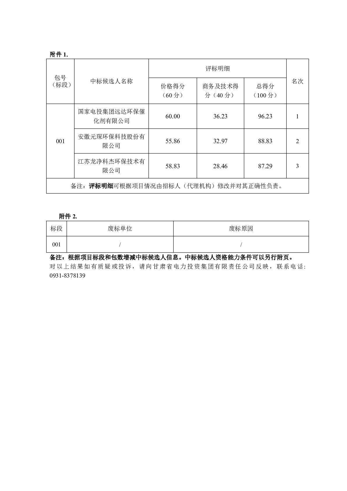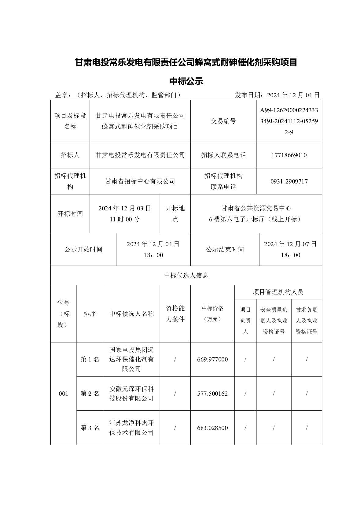 甘肃电投常乐发电有限责任公司蜂窝式耐砷催化剂采购项目 中标公示