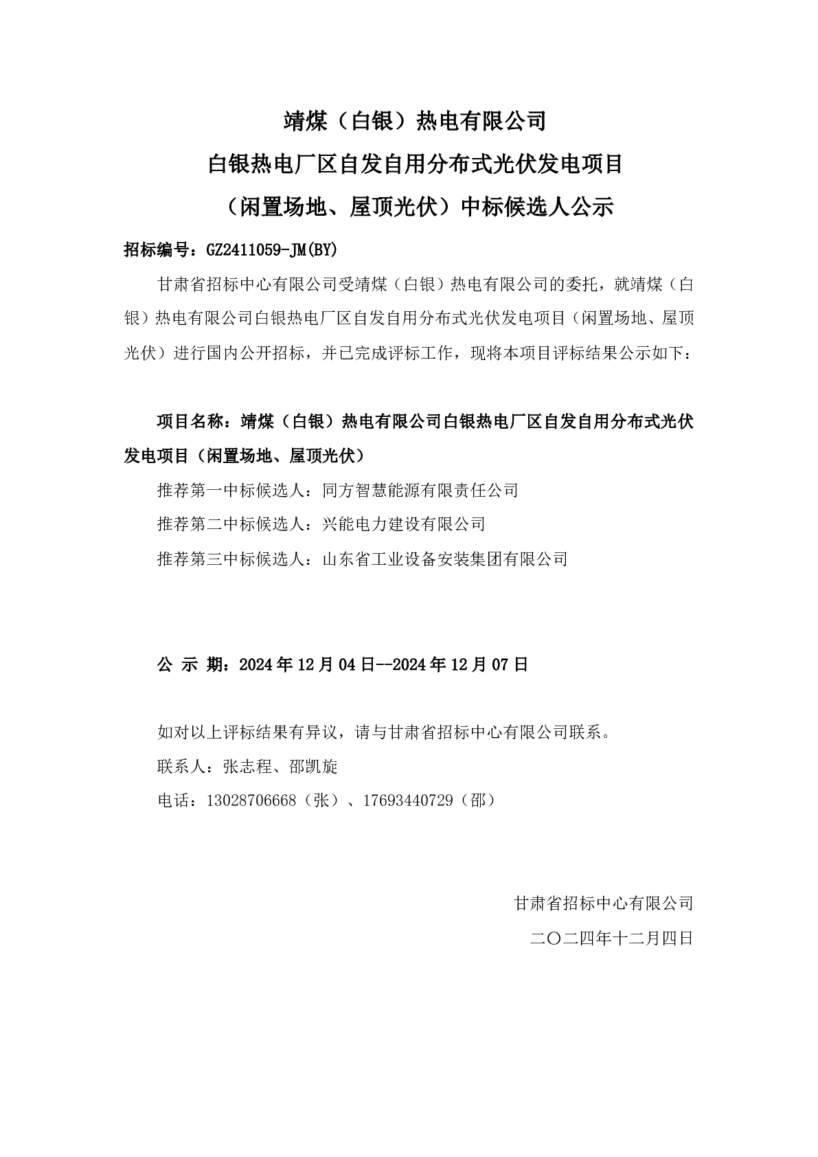 靖煤(白银)热电有限公司 白银热电厂区自发自用分布式光伏发电项目 (闲置场地、屋顶光伏)中标候选人公示