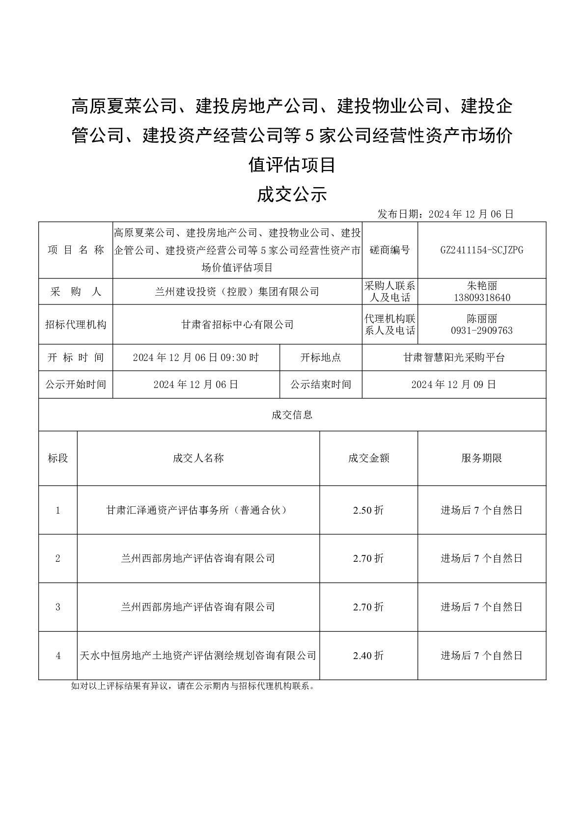 高原夏菜公司、建投房地产公司、建投物业公司、建投企 管公司、建投资产经营公司等 5 家公司经营性资产市场价 值评估项目 成交公示