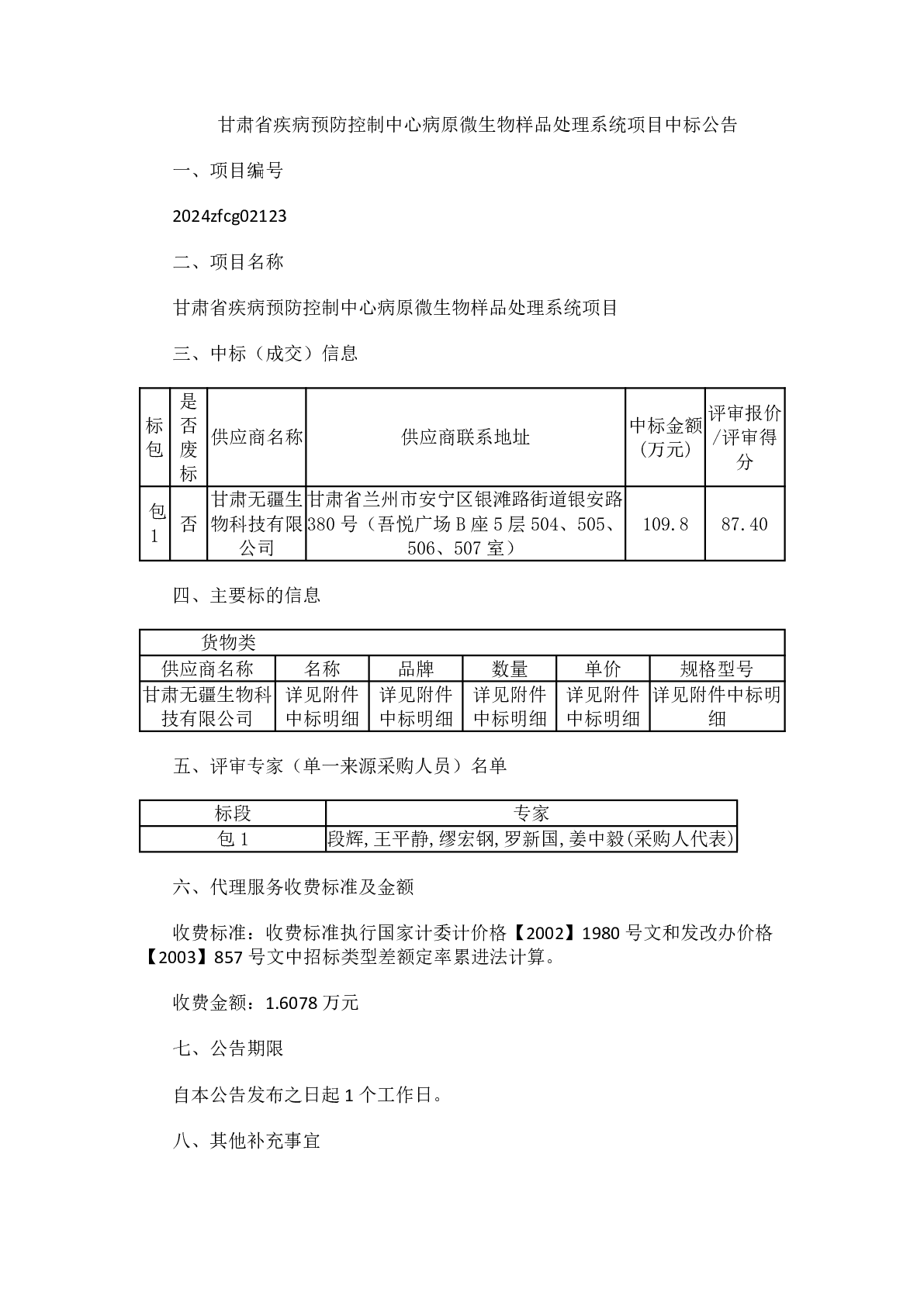 甘肃省疾病预防控制中心病原微生物样品处理系统项目中标公告