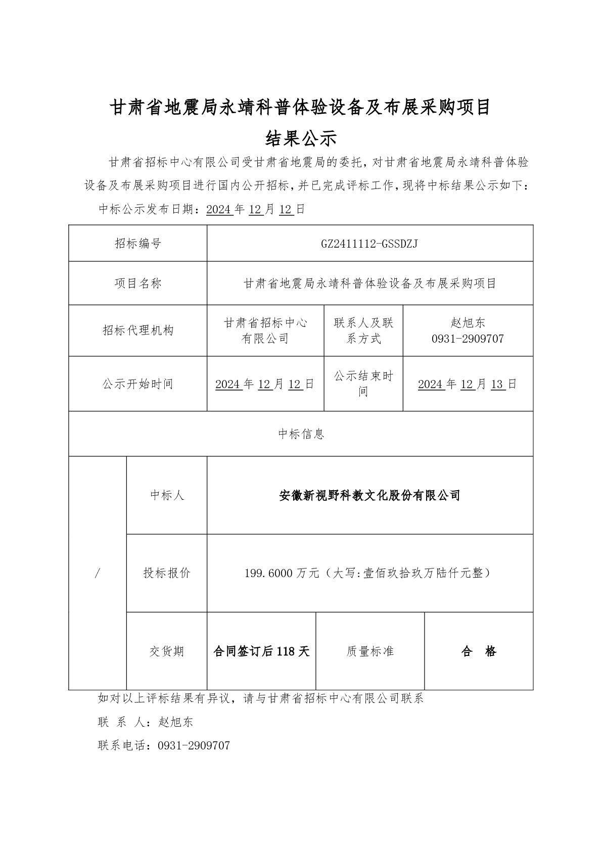 甘肃省地震局永靖科普体验设备及布展采购项目 结果公示