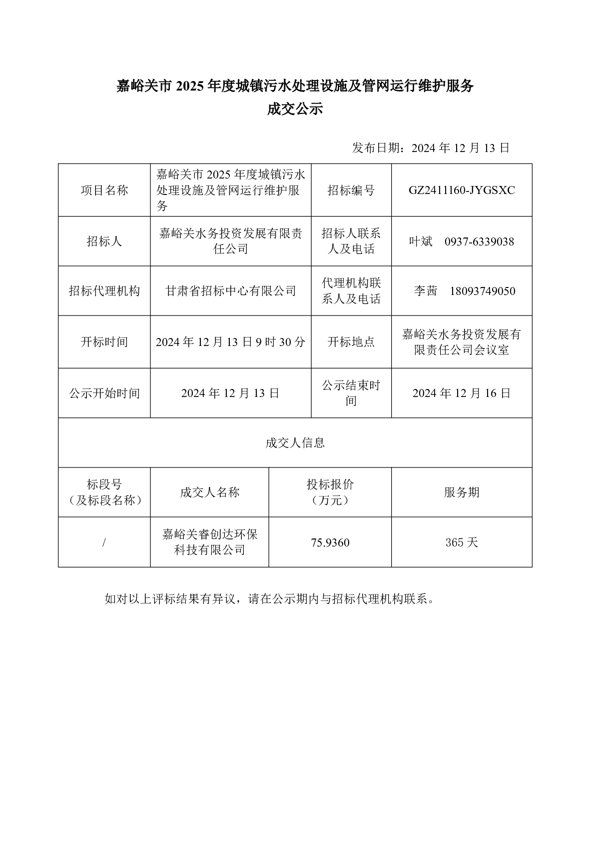 嘉峪关市 2025 年度城镇污水处理设施及管网运行维护服务 成交公示