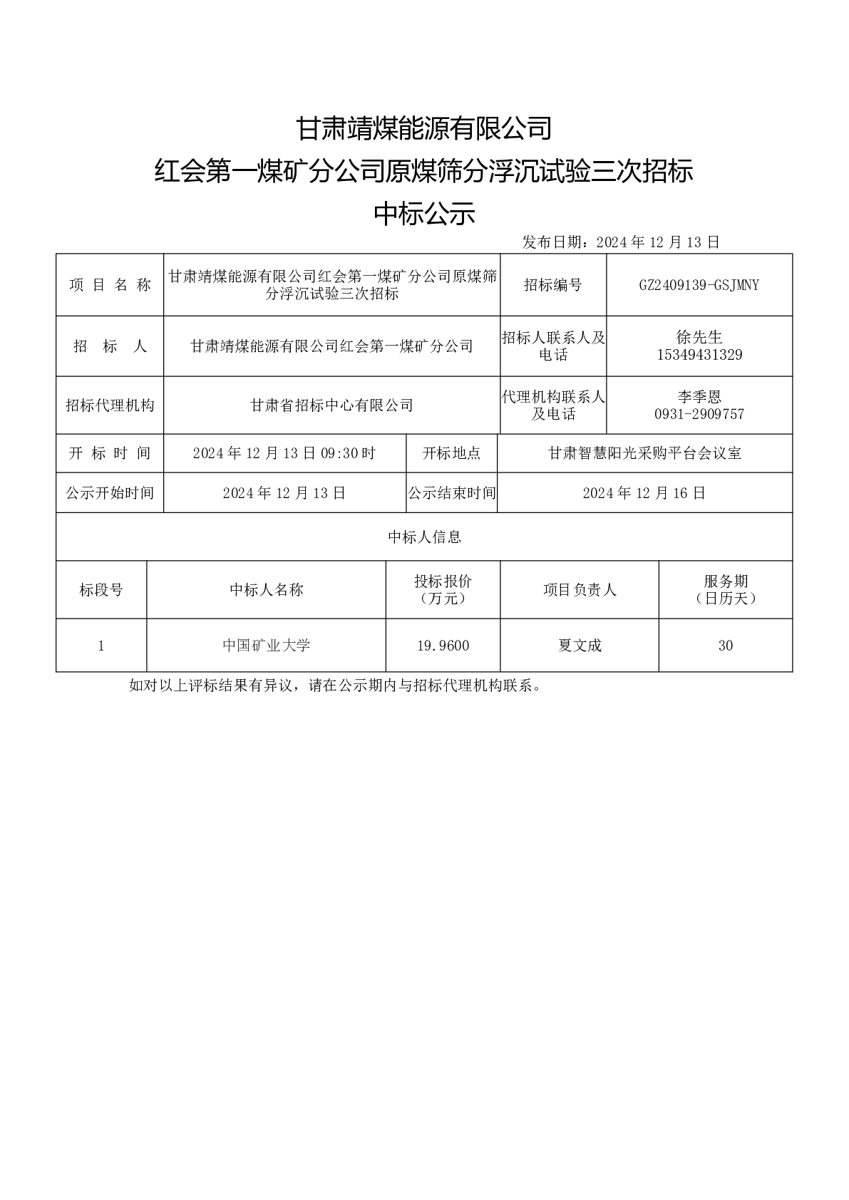 甘肃靖煤能源有限公司 红会第一煤矿分公司原煤筛分浮沉试验三次招标 中标公示