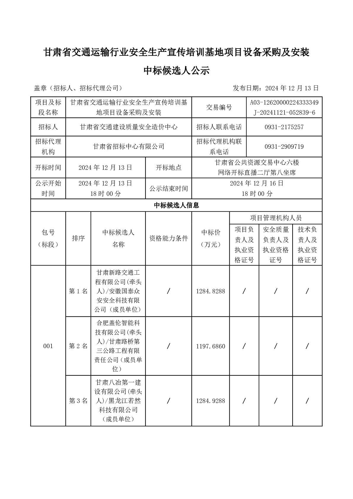 甘肃省交通运输行业安全生产宣传培训基地项目设备采购及安装 中标候选人公示