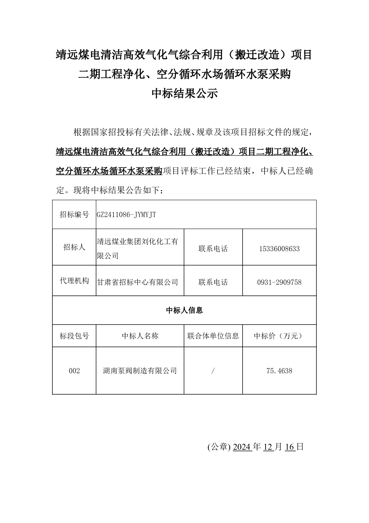 靖远煤电清洁高效气化气综合利用(搬迁改造)项目 二期工程净化、空分循环水场循环水泵采购 中标结果公示