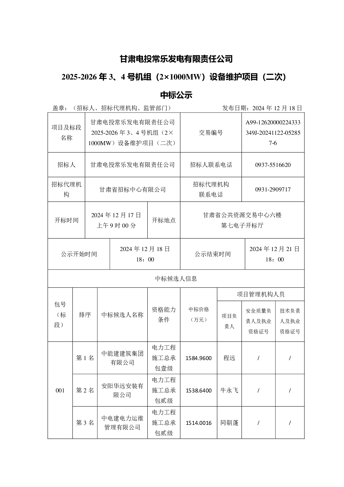 甘肃电投常乐发电有限责任公司 2025-2026 年 3、4 号机组(2×1000MW)设备维护项目(二次) 中标公示