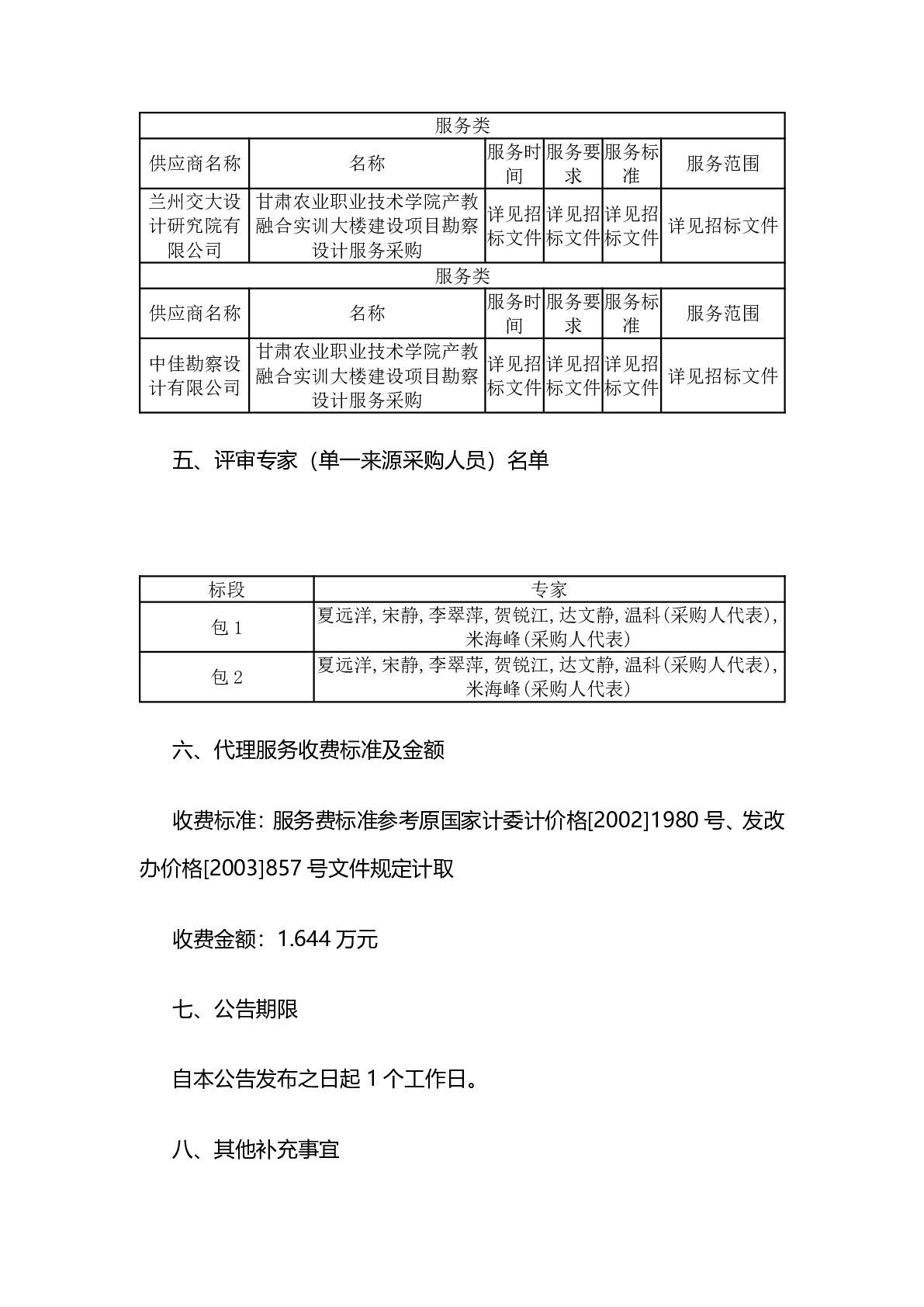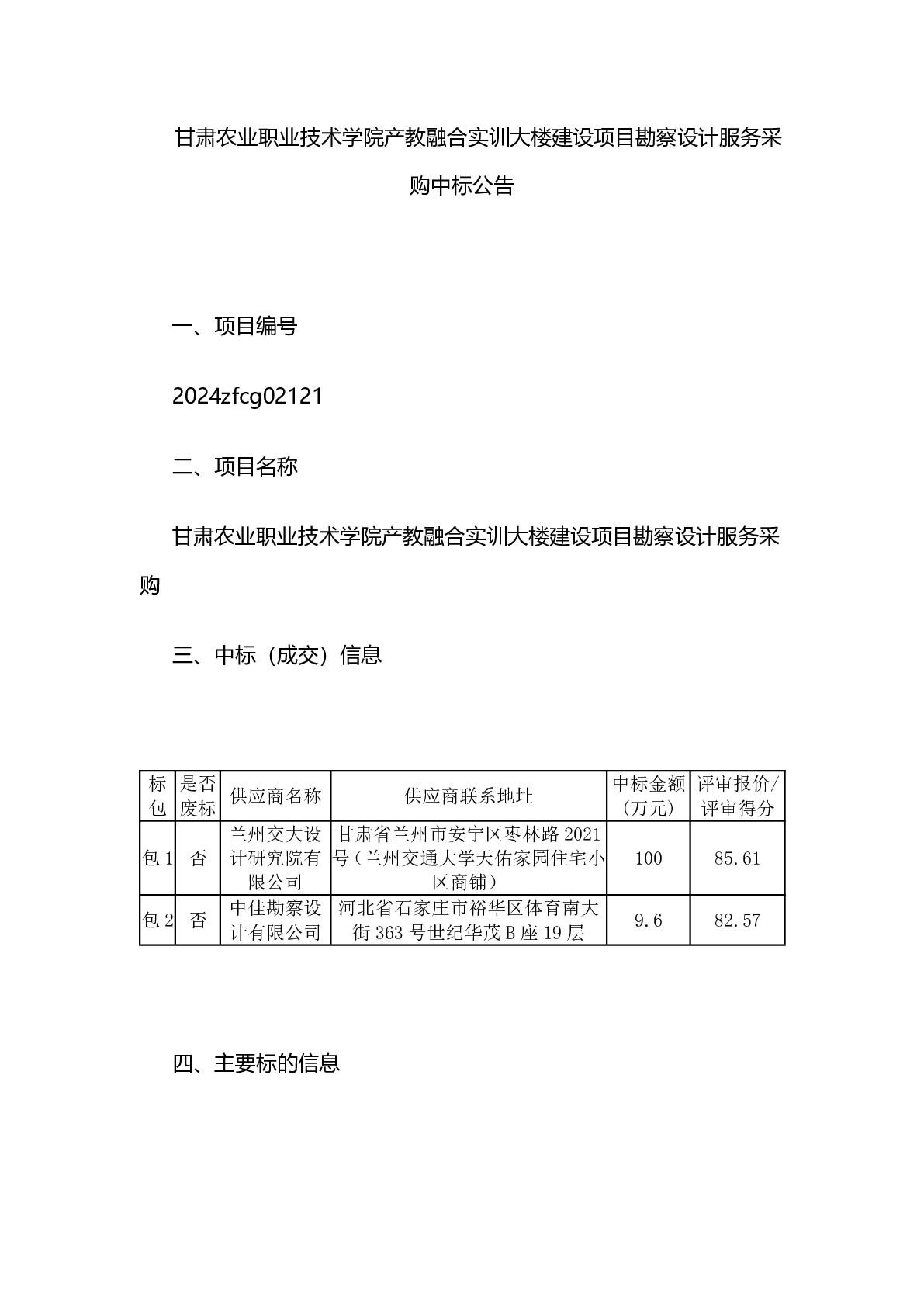 甘肃农业职业技术学院产教融合实训大楼建设项目勘察设计服务采 购中标公告