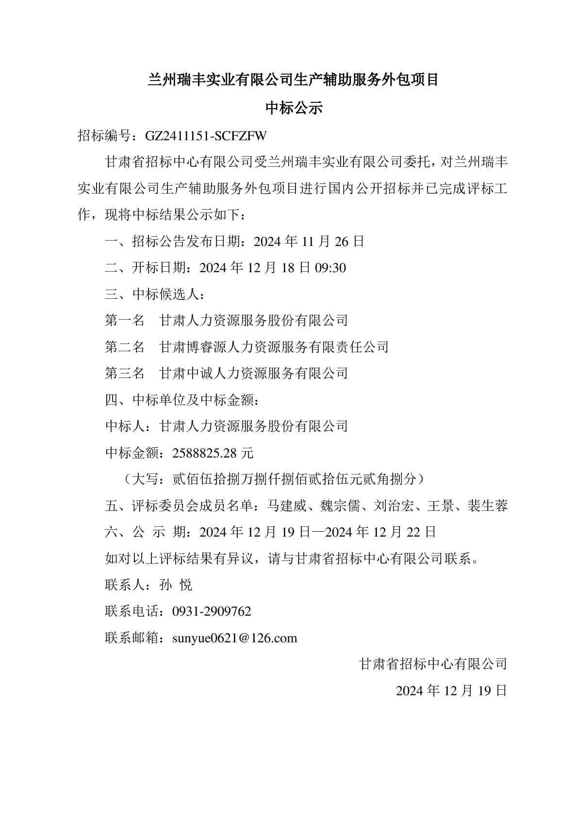 兰州瑞丰实业有限公司生产辅助服务外包项目 中标公示
