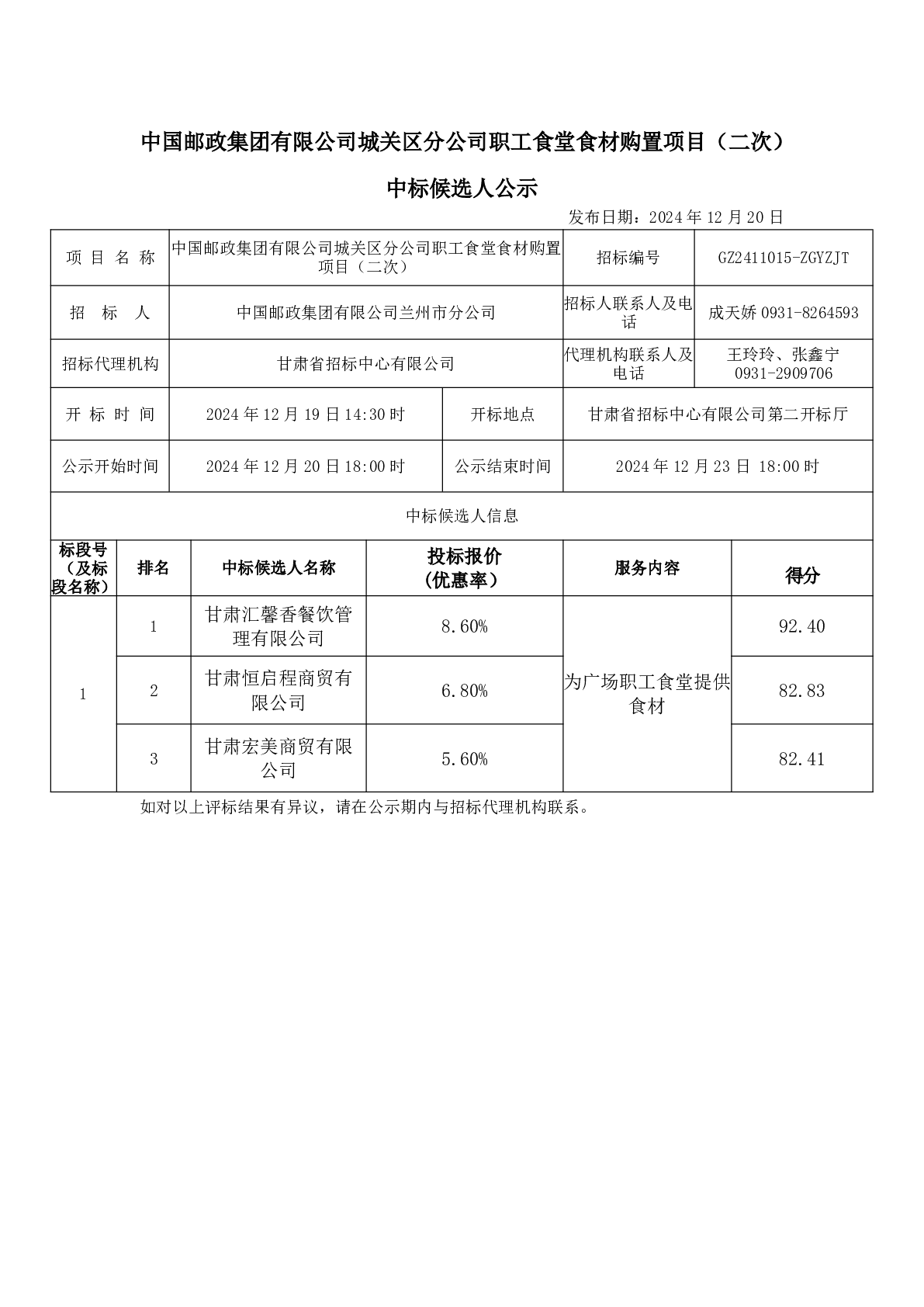 中国邮政集团有限公司城关区分公司职工食堂食材购置项目(二次) 中标候选人公示