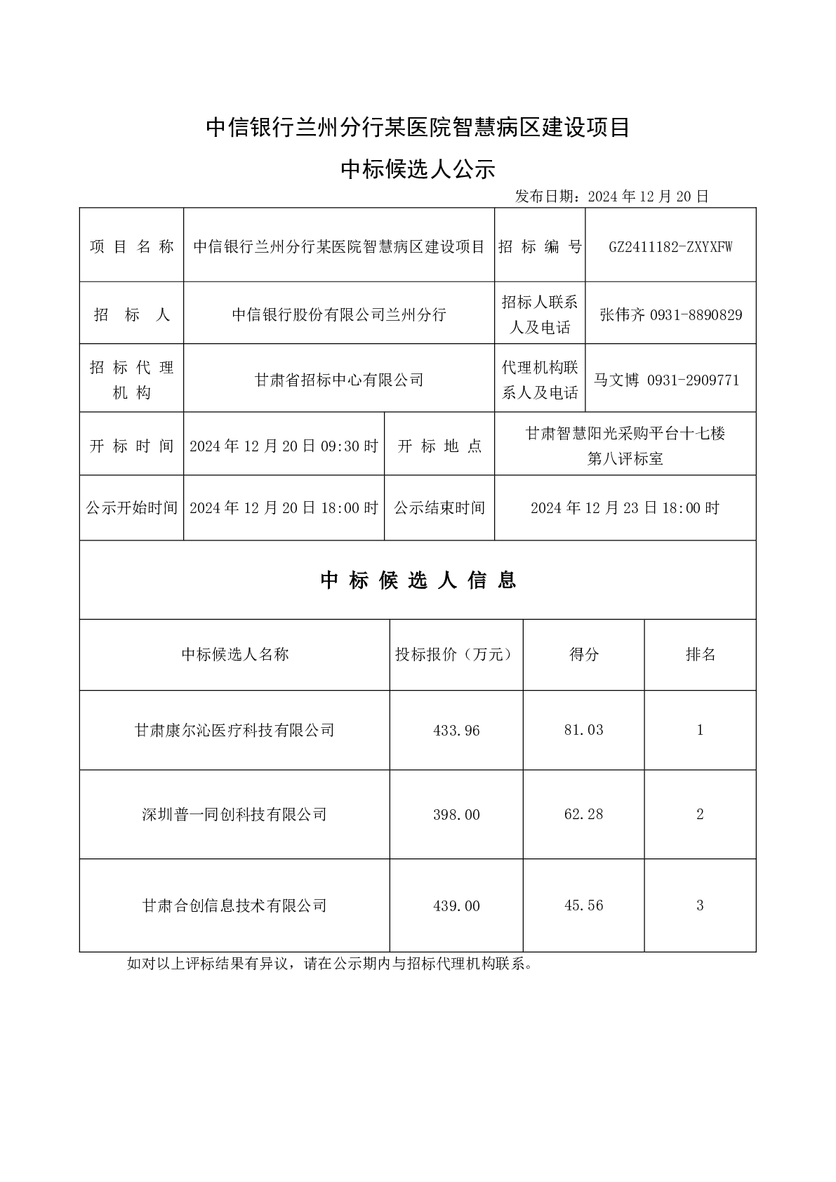 中信银行兰州分行某医院智慧病区建设项目 中标候选人公示