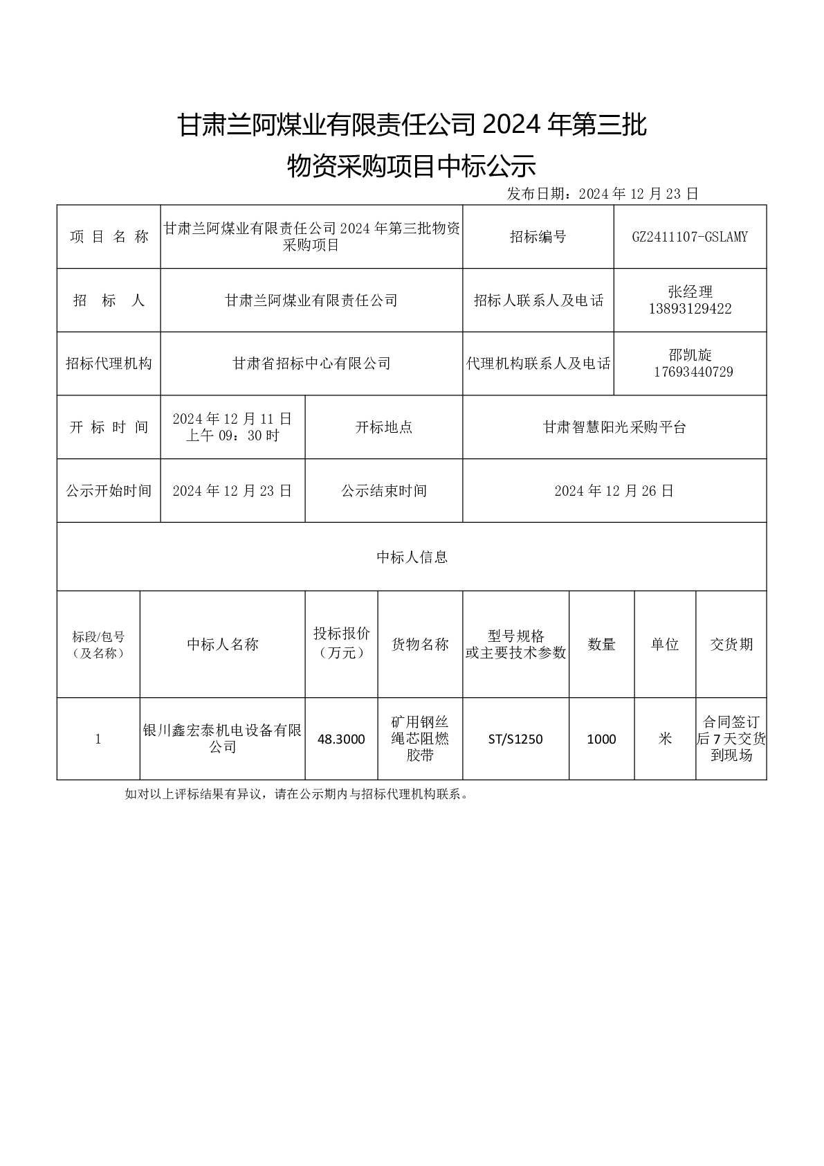 甘肃兰阿煤业有限责任公司 2024 年第三批 物资采购项目中标公示