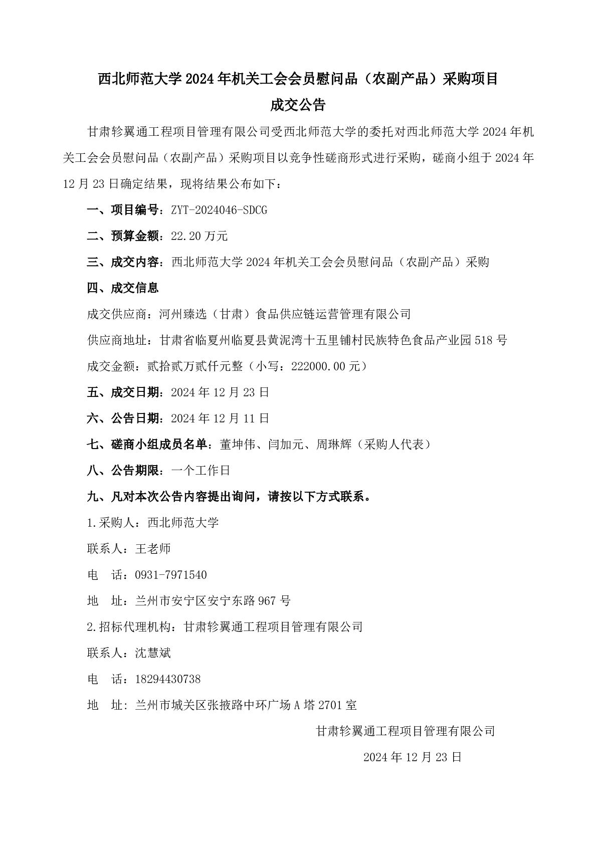 西北师范大学2024年机关工会会员慰问品(农副产品)采购项目
