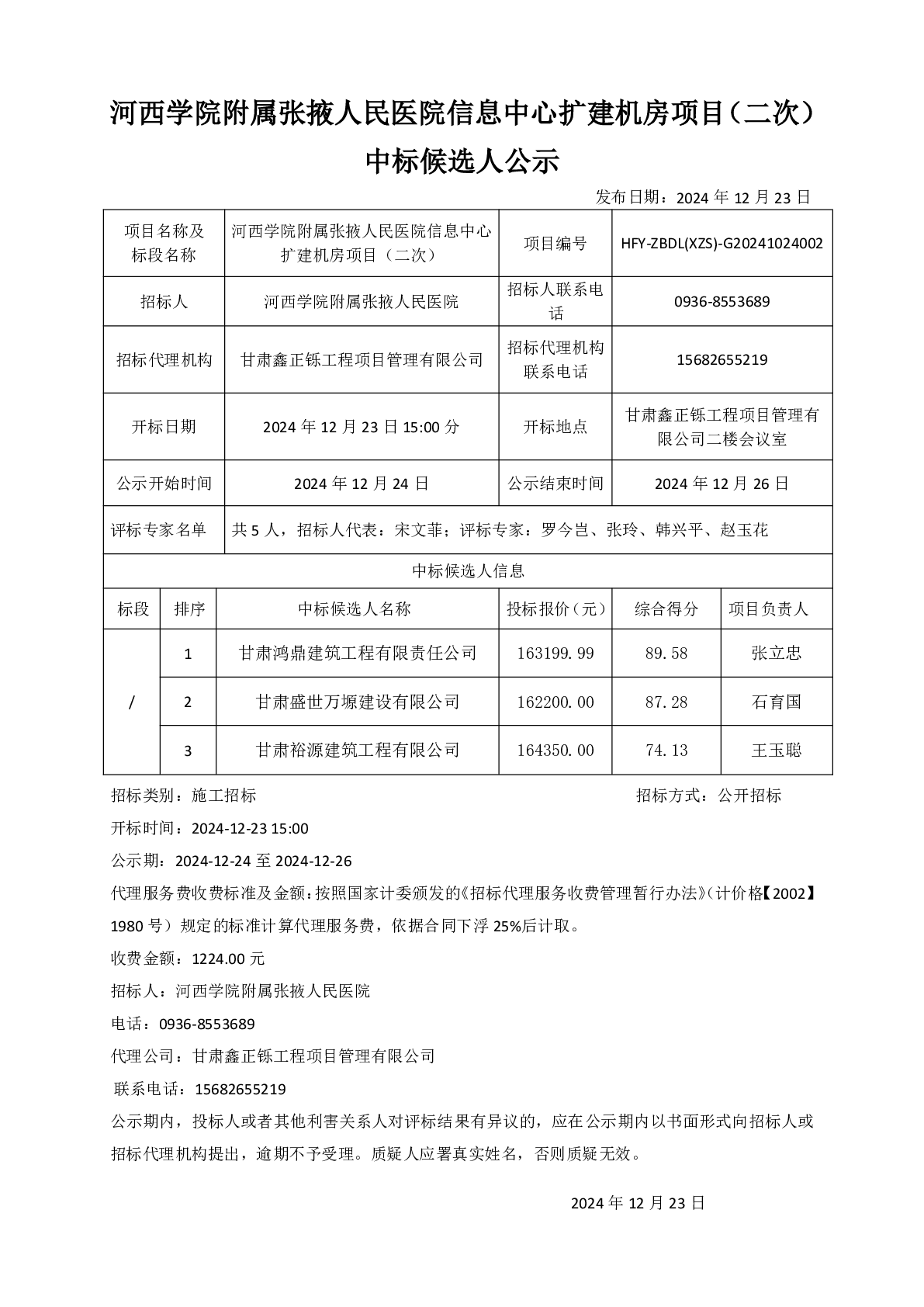 河西学院附属张掖人民医院信息中心扩建机房项目(二次)中标候选人公示