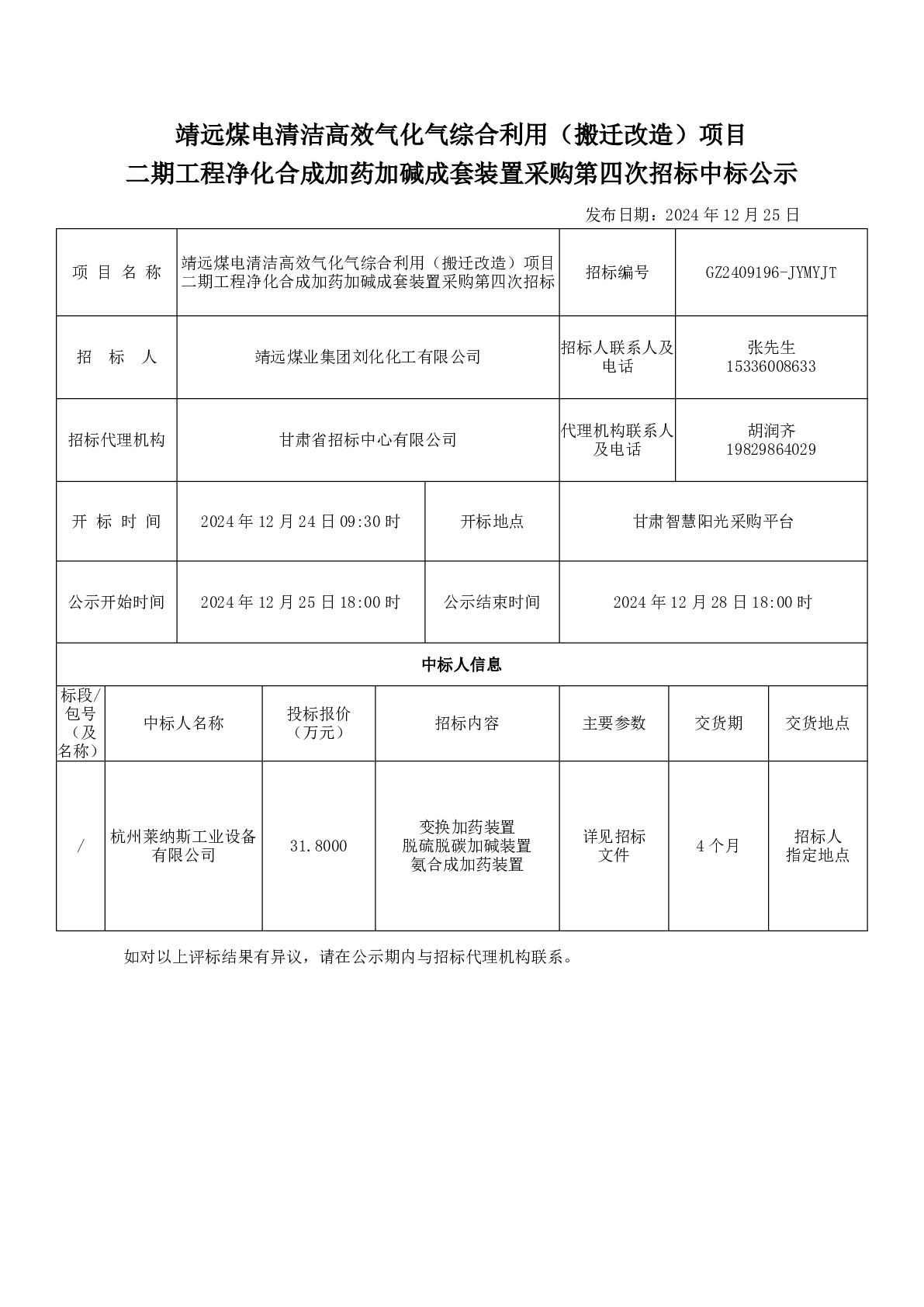 靖远煤电清洁高效气化气综合利用(搬迁改造)项目 二期工程净化合成加药加碱成套装置采购第四次招标中标公示