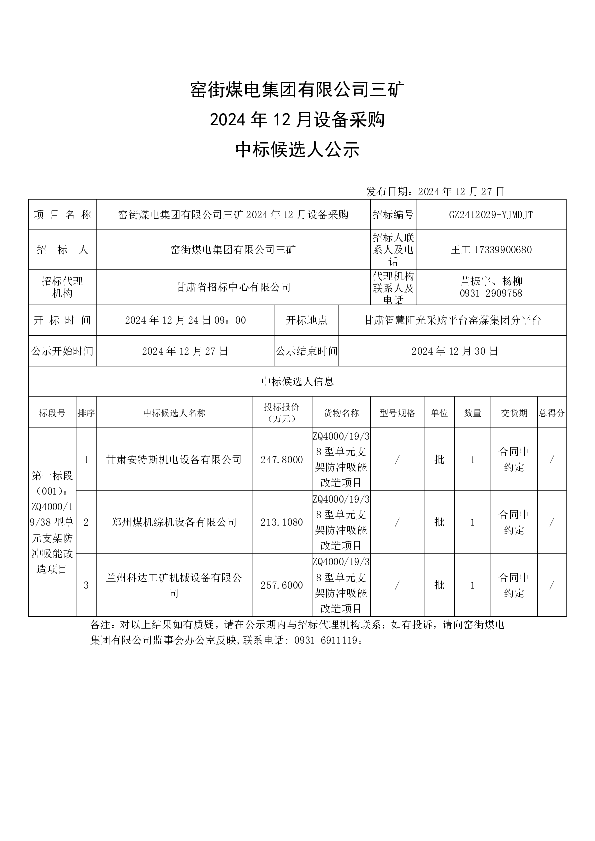 窑街煤电集团有限公司三矿 2024 年 12 月设备采购 中标候选人公示