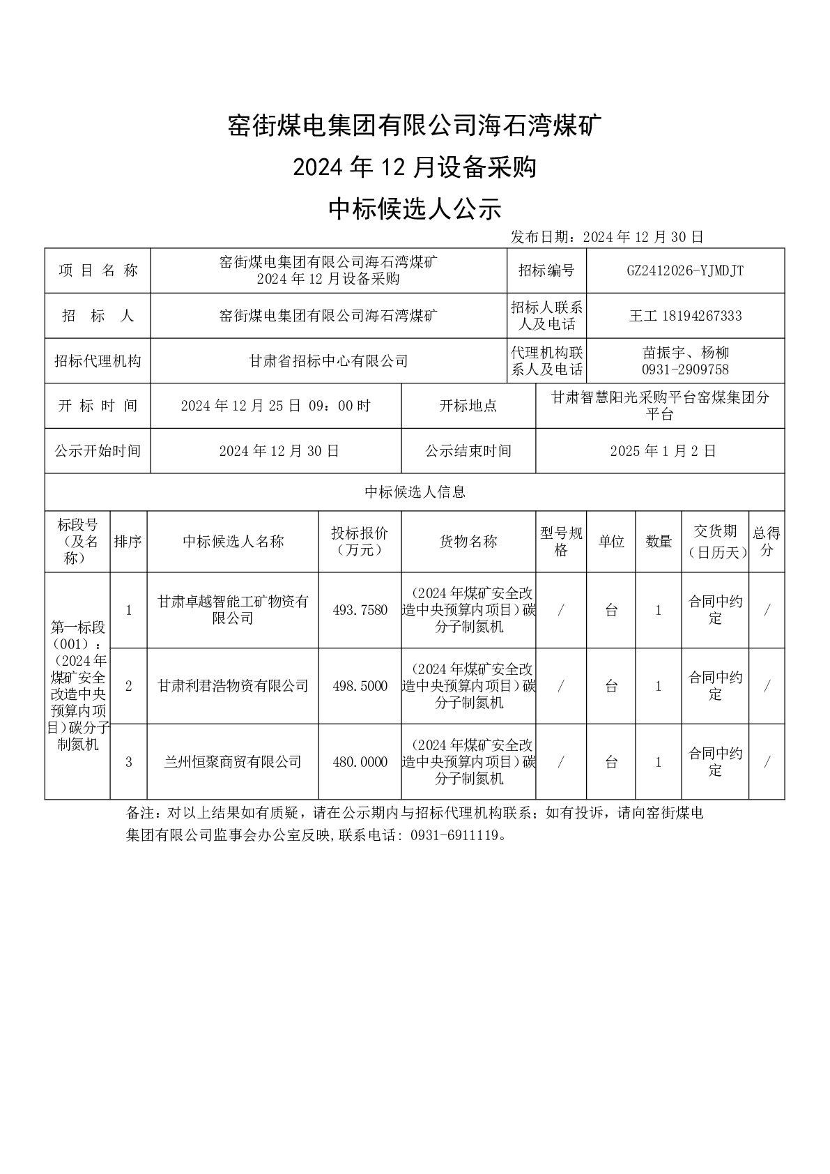 窑街煤电集团有限公司海石湾煤矿 2024 年 12 月设备采购 中标候选人公示