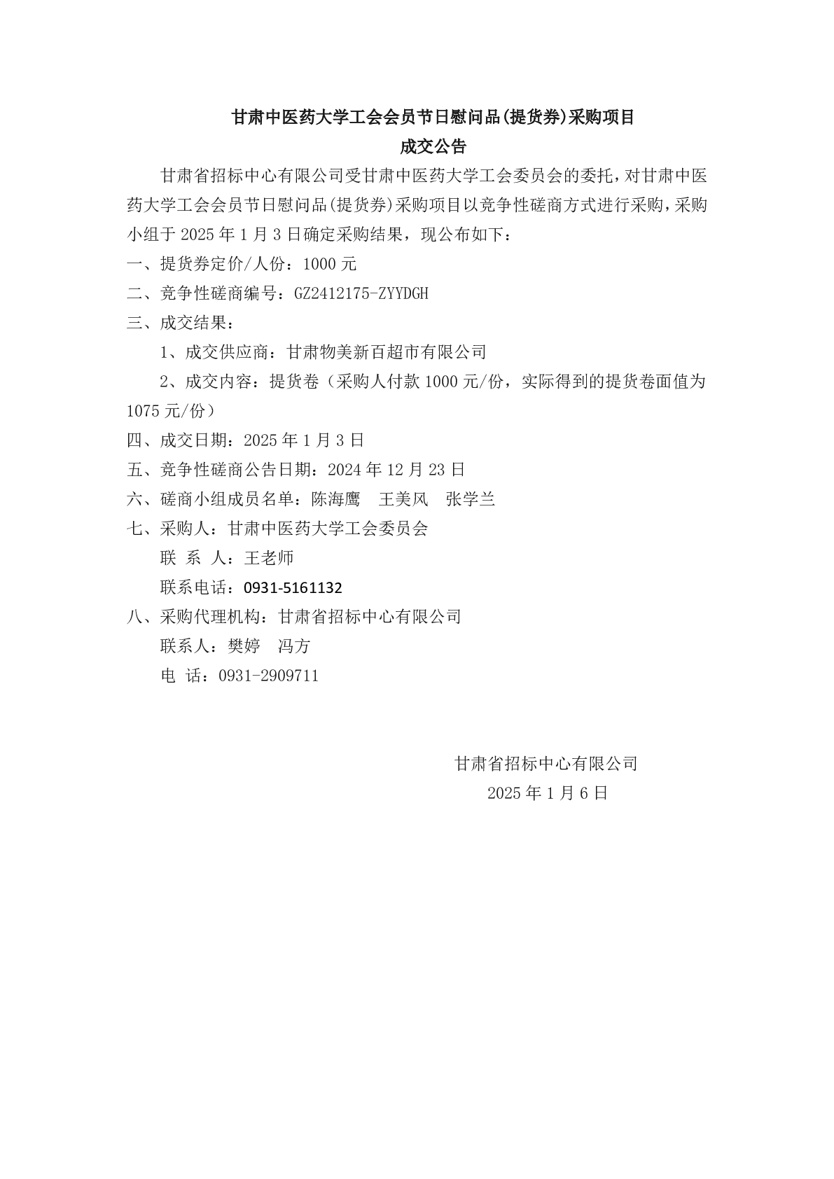 甘肃中医药大学工会会员节日慰问品(提货券)采购项目 成交公告