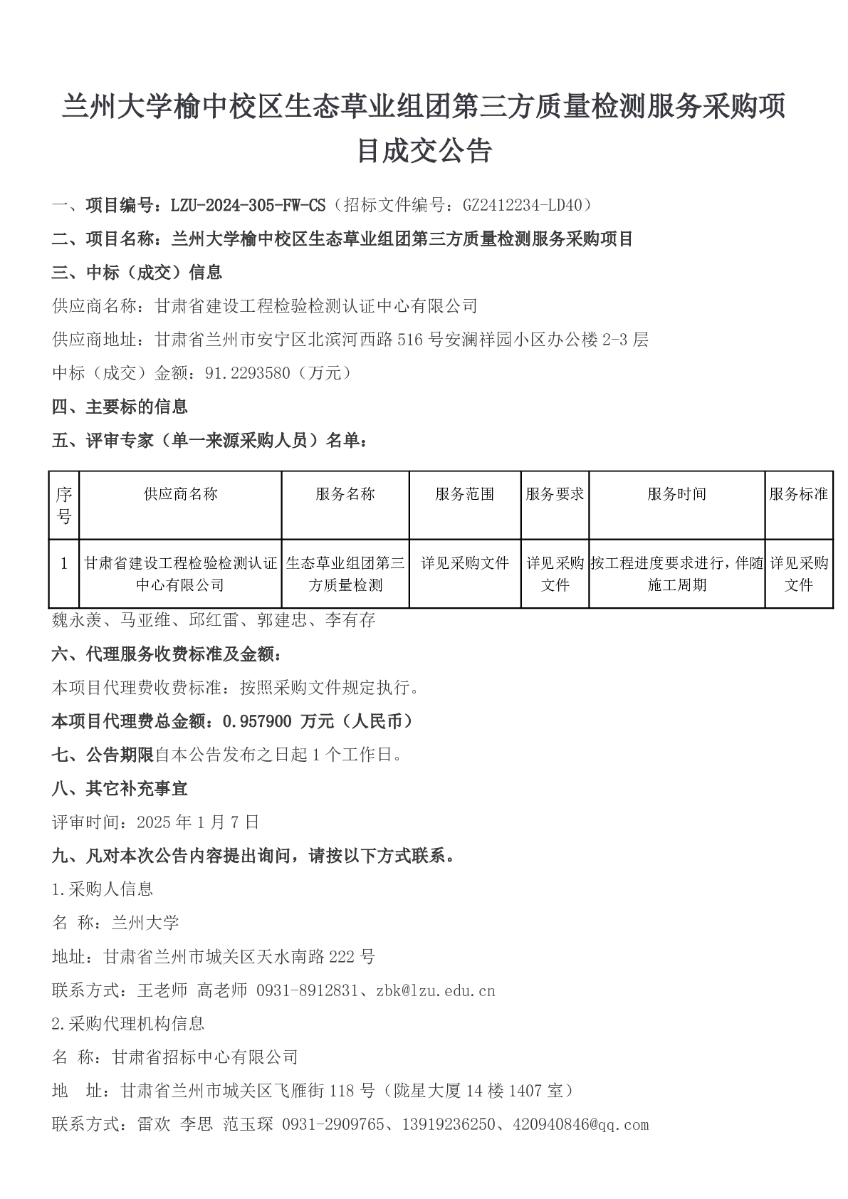 兰州大学榆中校区生态草业组团第三方质量检测服务采购项 目成交公告