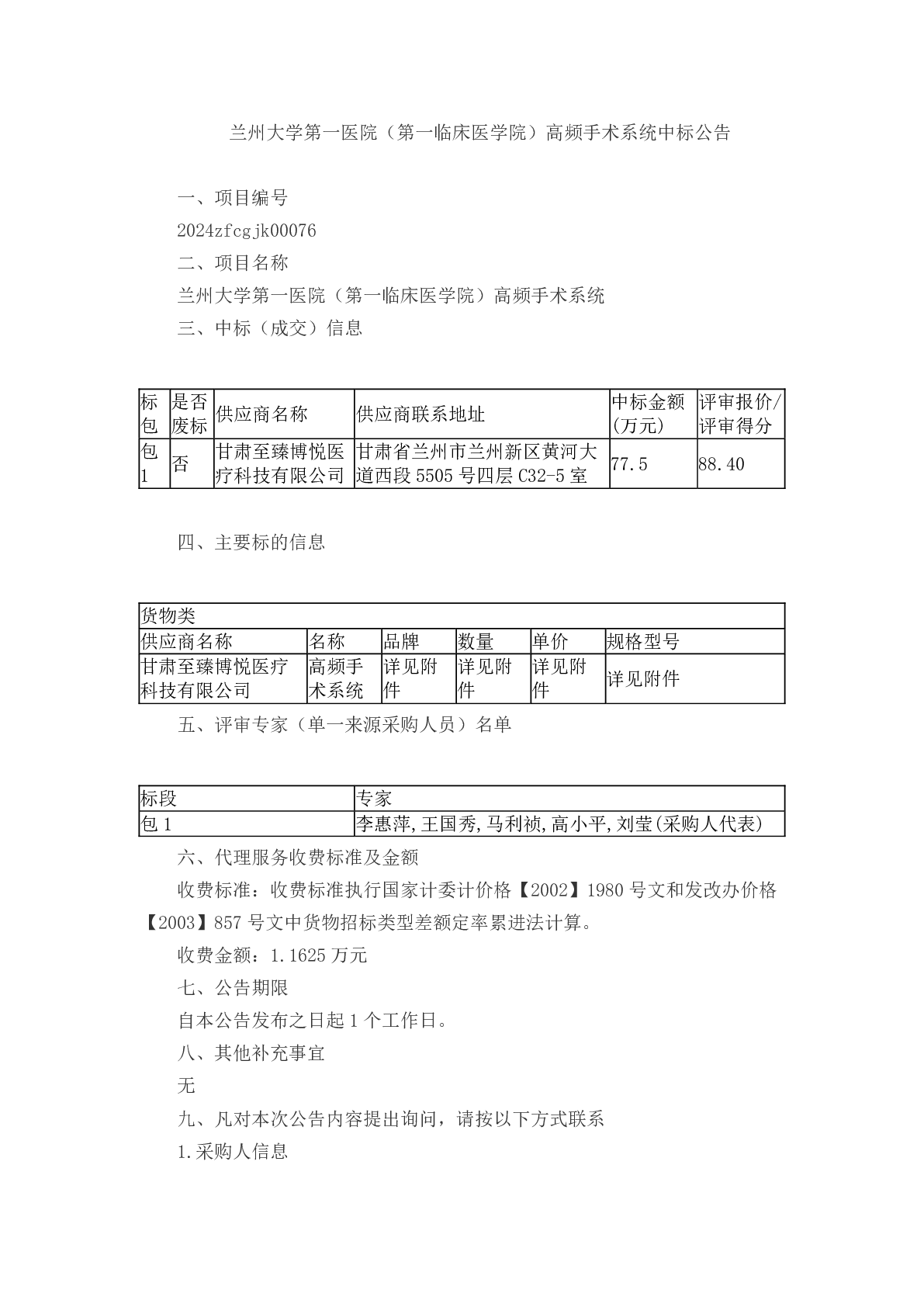 兰州大学第一医院(第一临床医学院)高频手术系统中标公告
