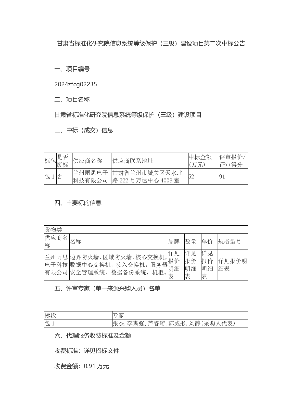 甘肃省标准化研究院信息系统等级保护(三级)建设项目第二次中标公告