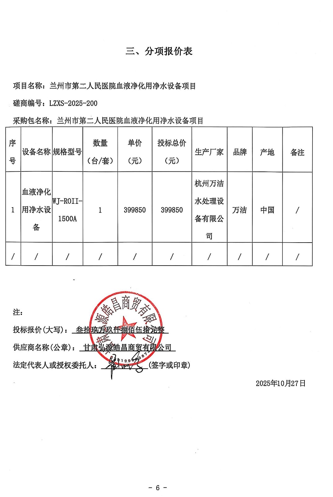 兰州市第二人民医院血液净化用净水设备项目成交公示