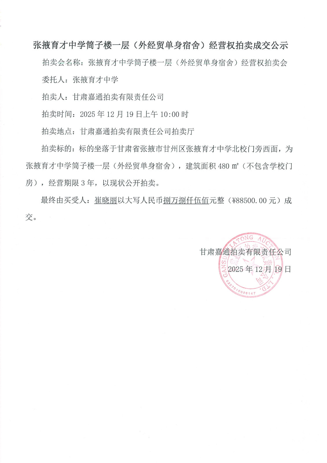 张掖育才中学筒子楼一层(外经贸单身宿舍)经营权拍卖成交公示