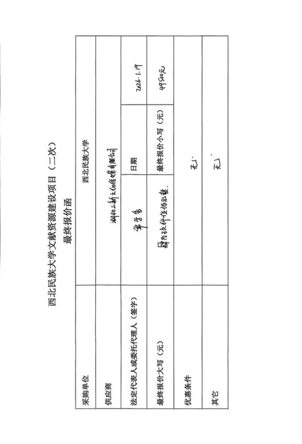 兰州兴晟工程造价咨询有限责任公司受西北民族大学的委托,就西北民族大学文献资源建设项目(二次)以竞争性磋商的方式进行采购,磋商小组于2026年1月19日确定成交结果,现将成交结果公布如下:
