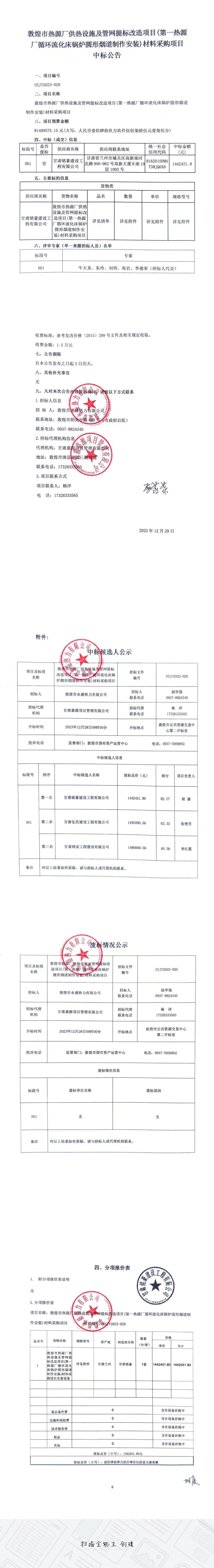 - 2023-12-29敦煌市热源厂供热设施及管网提标改造项目(第一热源厂循环流化床锅炉圆形烟道制作安装)材料采购项目中标公告