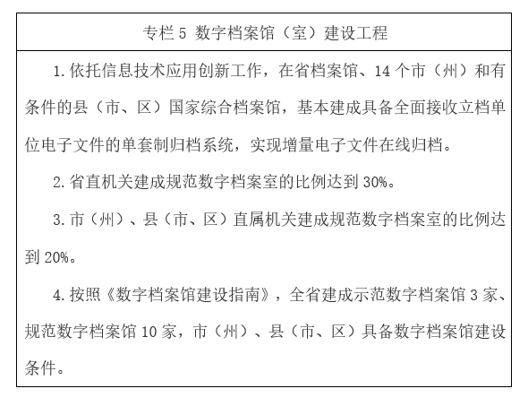 18.推进数字档案馆(室)建设。依托全省信息化基础设施建设环境,充分利用电子政务内外网和互联网平台,建设适应档案馆(室)数字档案管理需要的网络平台。在试点基础上全面推动全省数字档案馆(室)建设,加强大数据、人工智能等新一代信息技术在数字档案馆(室)建设中的应用,推动数字档案馆(室)建设优化升级,基本建成符合档案馆(室)业务实际功能要求、与全省国民经济和社会信息化水平相适应的数字档案馆(室)体系。推动各级国家档案馆全面建成档案信息管理系统,机关、团体、企事业单位和其他组织建设与办公自动化系统、业务系统相互衔接的电子档案管理系统。