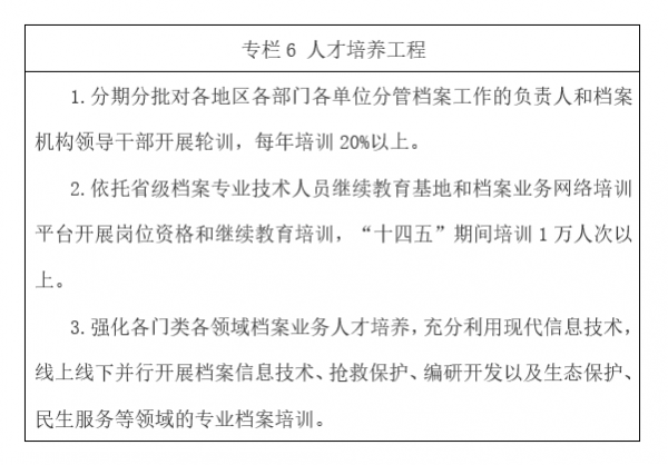 23.拓宽人才培养渠道。深化与各级党校(行政学院)和高等院校合作,建设档案人才培养基地,开展档案人才培养方面学术理论和教育培训交流活动,分期分批开展政治理论和档案信息技术、抢救保护、编研开发等业务轮训。推动在甘高等院校开设档案专业学科,加快档案高层次应用型人才培养。落实《档案专业人员继续教育规定》,加强继续教育师资队伍建设,推动继续教育形式多样化,完善继续教育学时制度,优化继续教育课程和教材,强化数字课程开发,推进教育资源共享,促进档案教育培训和互联网融合发展。培育支持档案职业教育,建立职业技能实训基地,探索档案技能型人才培养新路径。优化省市县三级工作学习交流平台,探索建立互派干部挂职、跟班学习机制。强化与其他省份档案部门和高等院校的联系,建立完善长效合作机制,积极开展跨省学习交流、人员挂职等合作。拓宽档案干部遴选、招录渠道,为各级档案部门引进专业人才。