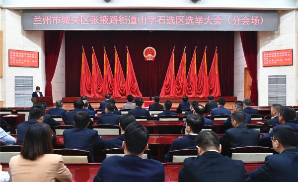 城关区广武门街道大教梁选区选举大会(分会场)国徽高悬、熠熠生辉,十面鲜艳的红旗分列两侧,红色的票箱端放正中,现场气氛庄重而热烈。