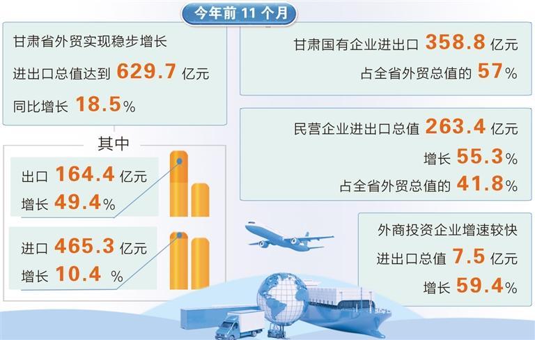 记者12月15日从兰州海关获悉,今年前11个月,甘肃省外贸实现稳步增长,进出口总值达到629.7亿元,同比增长18.5%。其中,出口164.4亿元,增长49.4%;进口465.3亿元,增长10.4%。