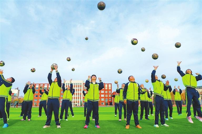 嘉峪关市实验中学学生在绿茵场做“足球操”。