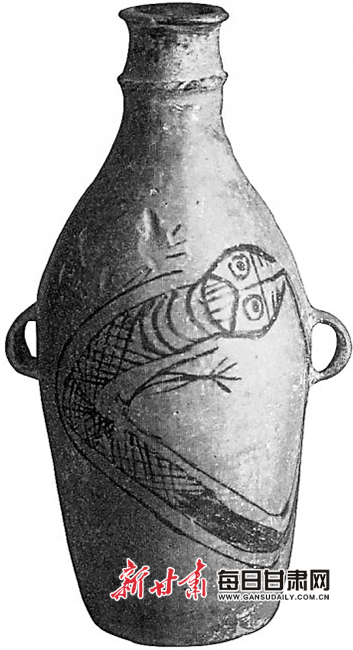 傅家门的人面鲵鱼纹彩陶瓶,现藏甘肃省博物馆,1958年发现于武山马力公社傅家门村。高18.5厘米,鲵鱼身子蜷曲,尾巴上翘,人面双眼圆睁,嘴巴宽阔,颌下有须,腹部肥大,前两肢张开,纹饰为网络状,线条流畅,布图对称,头部线条较为粗壮,创作者有意识突出表现鲵鱼的头部图饰。鲵鱼,天水一带称娃娃鱼,先民视作神物。傅家门彩陶上的鲵鱼图像将鲵鱼人格化为人间的神灵,并将代表风、雨、雷、电的龙蛇,与代表人的智慧的人首相结合,反映了先民天人合一的认识观念。这件彩陶瓶和甘谷县石坪村出土的双耳鲵鱼纹彩陶瓶,与《山海经·海内东经》、唐司马贞《补三皇本纪》等典籍记载的“龙身人首”的伏羲形象完全一样,学术界普遍认为人面鲵鱼是人格化的人首龙身或人面蛇身的伏羲形象。