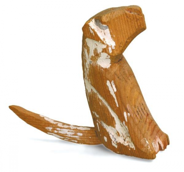 且看看两只彩绘木卧狗。同是卧狗,却完全是两种不同的姿态:一只头、躯体、尾巴伸长成一线,懒散无聊地趴地歇息,耳朵却竖起来,很警惕地听着周围的动静;一只就像我们常见的狗狗那样,卧地抬头,嘴巴半张,看它抬头张望的神态,那是一副随时准备一跃而起的心态;再看那只彩绘木坐狗,尾巴拖着,头半仰,一看就是只小狗,正呆萌地看着主人等喂食呢。
