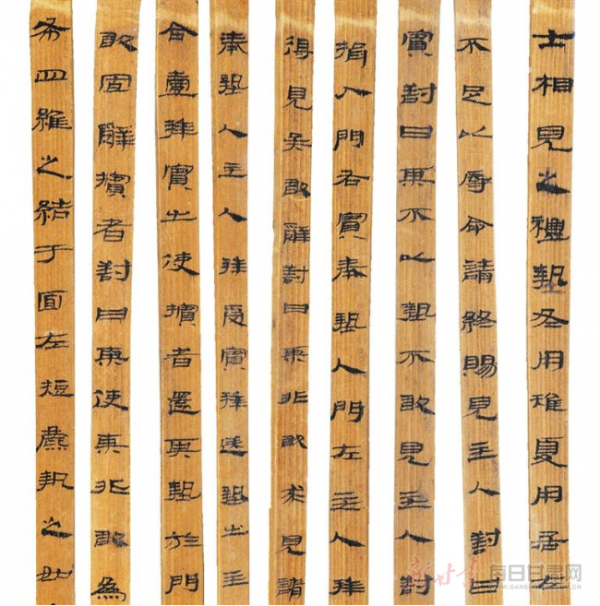 “礼仪出大家”。《仪礼》确实是上层社会的各项礼仪准则。可是,传承文明并使之发扬光大的不仅仅是贵族阶层,普通的知识分子乃至社会的普通民众更是文明的创造者和传播者。就如《仪礼》简上一行行端正秀丽的隶书,蚕头燕尾、逆入平出,笔势流畅,工整秀丽,简直是书法界的奇珍异宝!而这笔端秀的汉隶不过出自一位名不见经传的读书人之手而已。所谓,大家在民间!