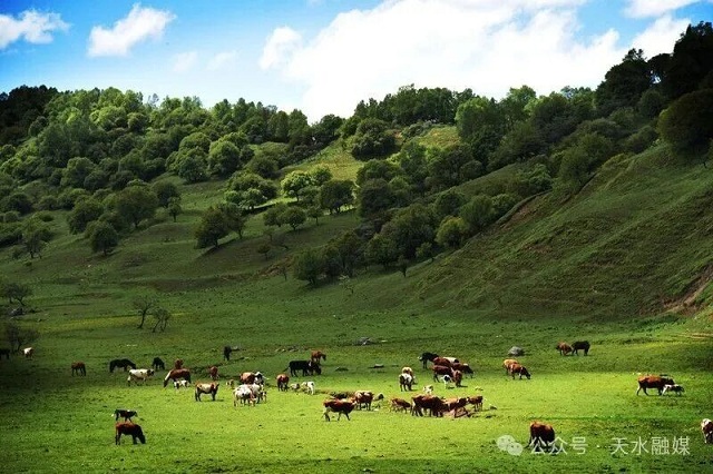 张家川县的关山草原,以浑圆起伏的峰峦、舒展的梁脊、开阔的宽谷与平缓的坡地,勾勒出层次分明的景观骨架。连片的苍翠林木与茵茵草甸铺展成主色调,将大地晕染得生机盎然。成群的牛羊如散落的星辰点缀在绿毯般的草地上,有的低头细品鲜嫩青草,有的昂首眺望远方天际,偶尔轻甩尾巴驱赶蚊虫,一举一动都透着自在悠闲。潺潺溪流顺着地势蜿蜒流淌,澄澈的潭池如明镜般倒映着蓝天白云与牛羊身影,清风拂过,裹挟着草木清香,凉爽气候更添几分惬意,营造出沁人心脾的宜人氛围。