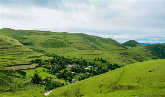 大庄草原静卧在天水市秦州区西部的杨家寺镇境内,像一块被时光温柔呵护的璞玉。远处的山峦如墨色剪影般起伏连绵,线条柔和如黛,沟壑顺着山势纵横交错,将大地切割出自然的肌理,山涧溪流顺着沟壑悄悄流淌,滋养得两岸水草丰美,漫山遍野都透着勃勃生机,孕育出这片天然牧场的温润底色。